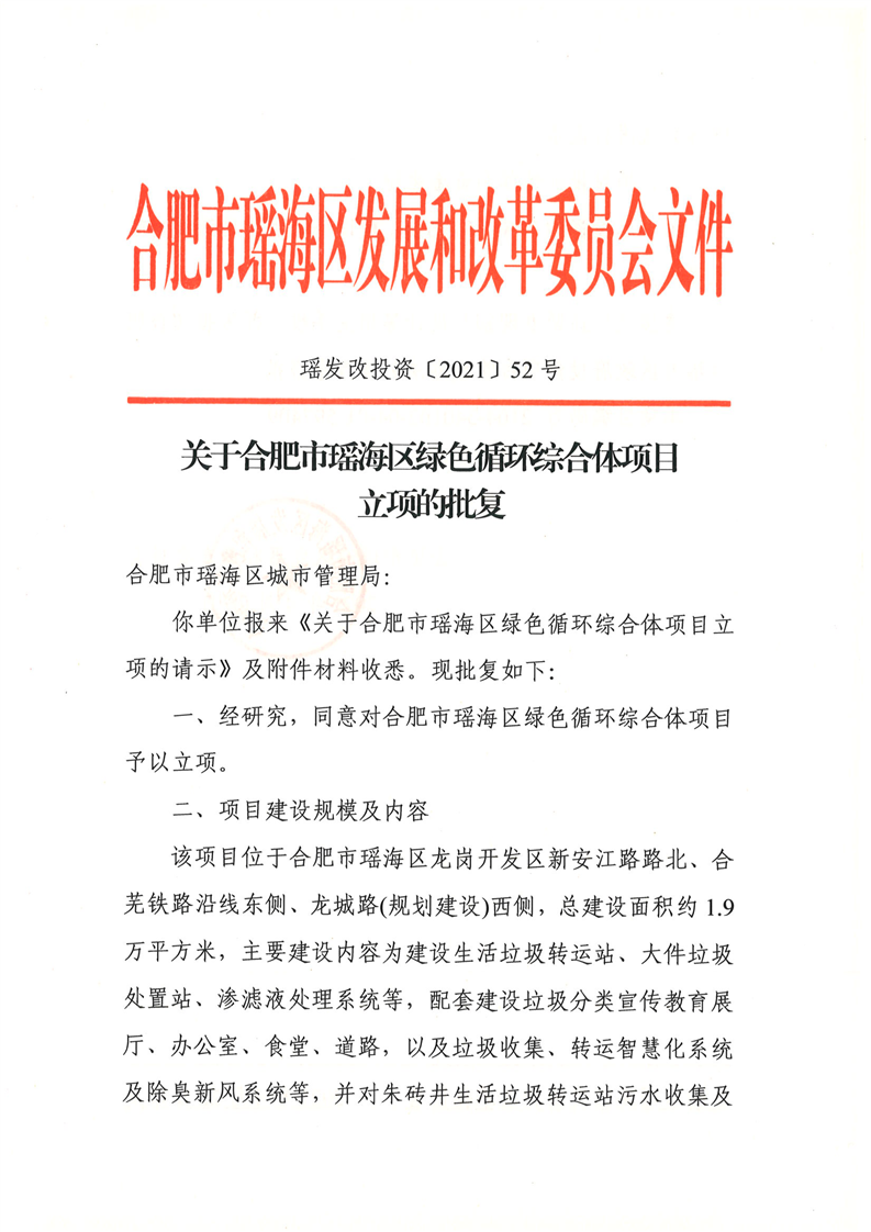 | 名 称: | 关于合肥市瑶海区绿色循环综合体项目立项的批复 | ||