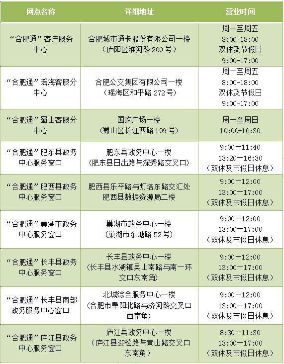 (六)如对“合肥通”卡的业务办理有疑问,可拨打合肥城市通卡股份有限公司客服电话:62851595,工作时间为:上午8:00至下午17:30,节假日不休息。