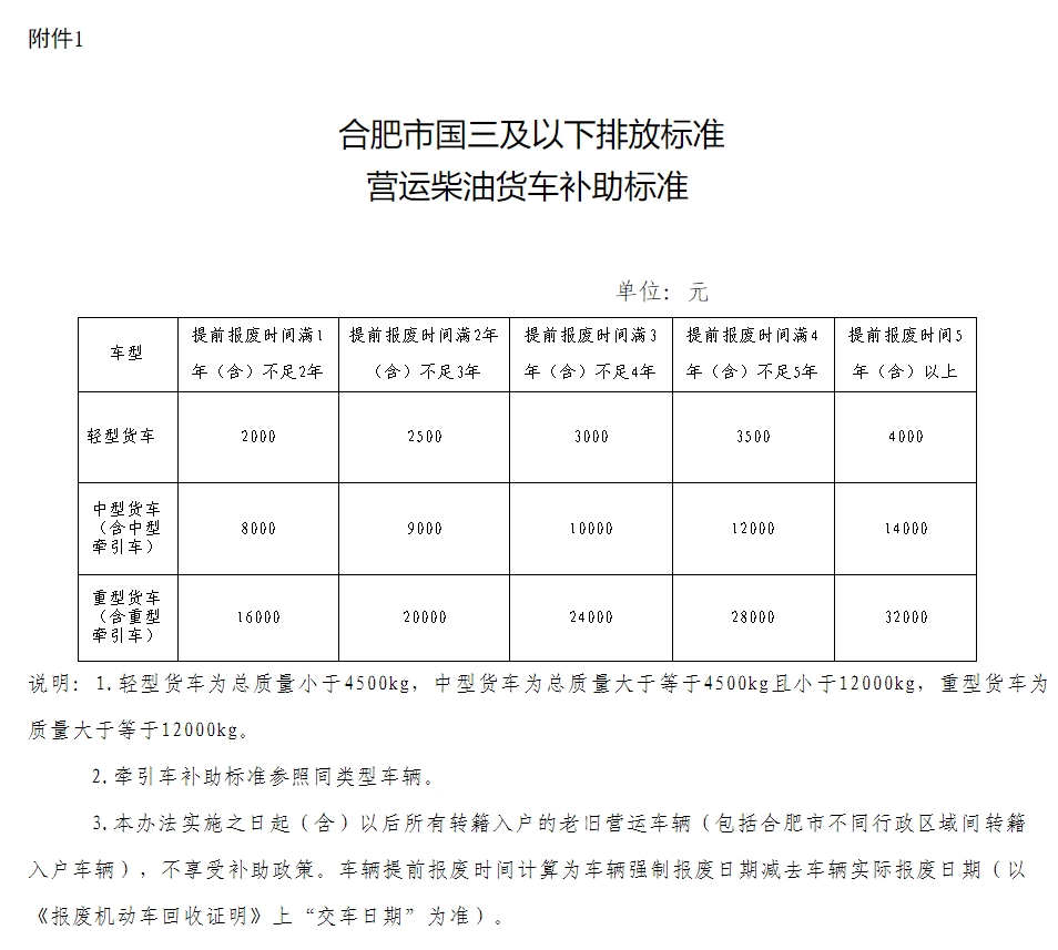 附件:1.合肥市国三及以下排放标准营运柴油货车补助标准