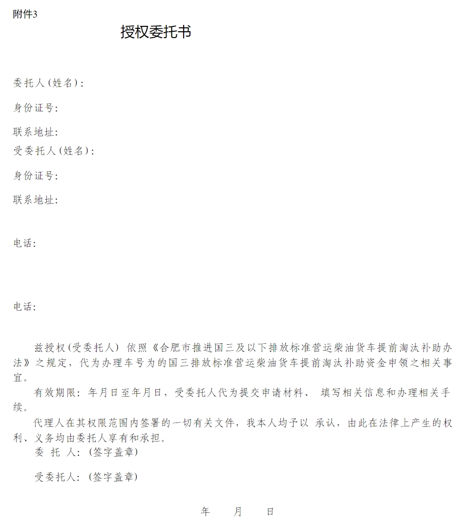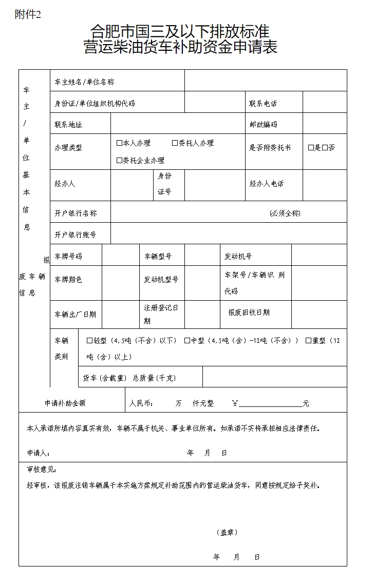 2.合肥市国三及以下排放标准营运柴油货车补助资金申请表