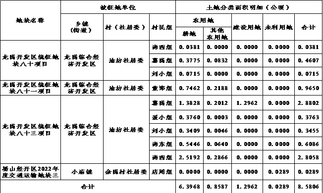 本次批准征收土地面积8.5806公顷(128.7090亩),其中:农用地7.2555公顷(108.8325亩),含耕地6.3968公顷(95.9520亩)、永久基本农田0公顷(0亩);建设用地1.2962公顷(19.4430亩);未利用地0.0289公顷(0.4335亩)。具体现状如下表: