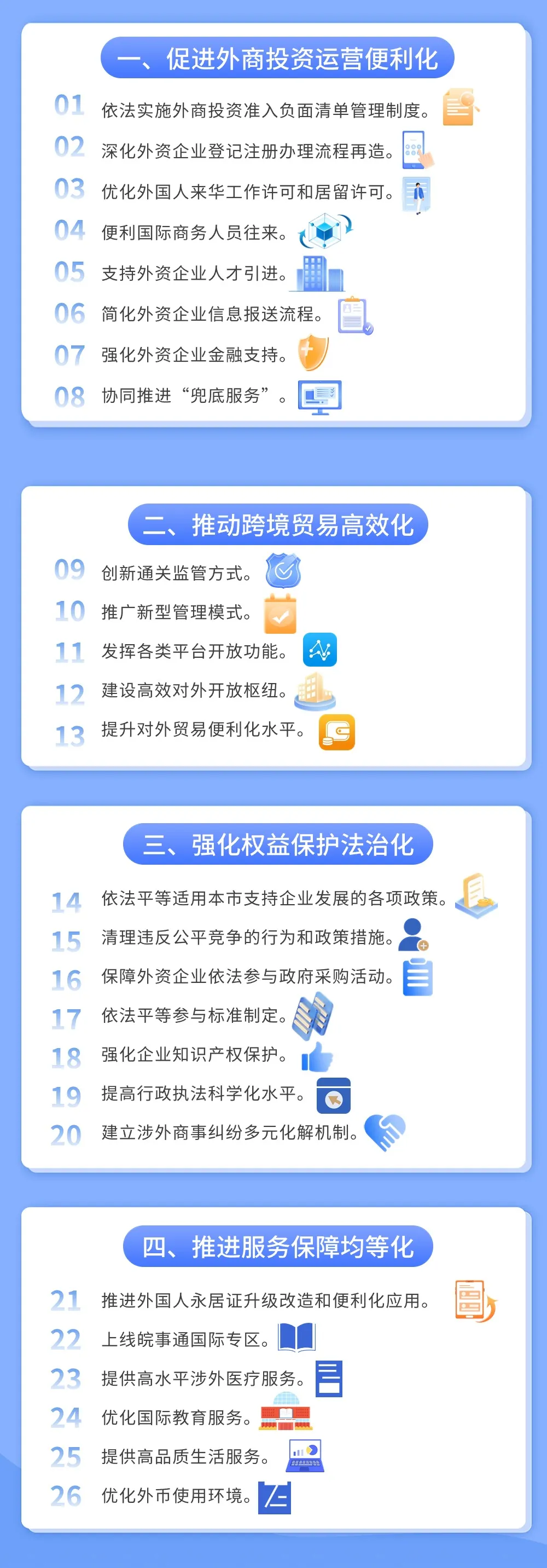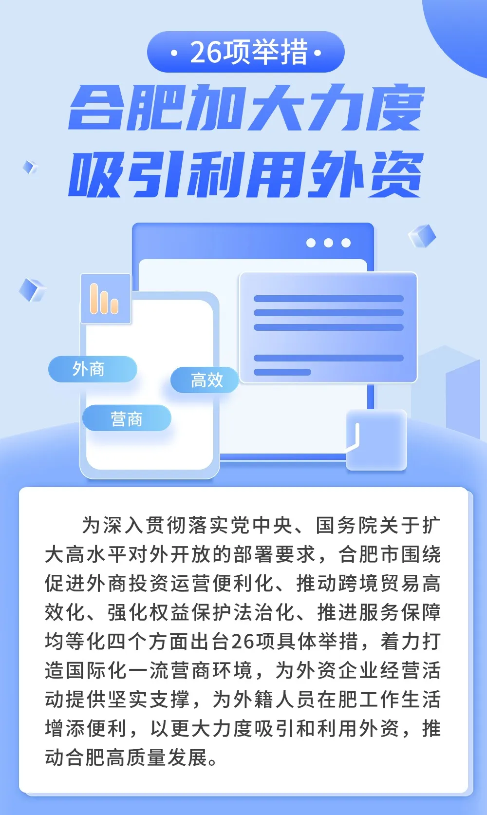 为深入贯彻落实党中央、国务院关于扩大高水平对外开放的部署要求,合肥市围绕促进外商投资运营便利化、推动跨境贸易高效化、强化权益保护法治化、推进服务保障均等化四个方面出台26项具体举措,着力打造国际化一流营商环境,为外资企业经营活动提供坚实支撑,为外籍人员在肥工作生活增添便利,以更大力度吸引和利用外资,推动合肥高质量发展。(一)依法实施外商投资准入负面清单管理制度。禁止在国家发布的外商投资准入负面清单以外制定外商投资准入的限制或者禁止性措施。外商投资准入负面清单以外的领域,按照内外资一致的原则实施管理,外国投资者与内资企业同等条件进入。鼓励支持外资企业在肥设立研发中心、产业创新中心、概念验证中心等,支持外资企业参与绿电交易和绿证交易。(二)深化外资企业登记注册办理流程再造。加快建立外国投资者身份认证数据对接验证机制和异地主体资格互认机制,实现外资企业登记注册全过程网上办理。(三)优化外国人来华工作许可和居留许可。扩大外国人工作居留许可“单一窗口”服务范围,实现A、B、C三类外国人工作居留许可“一窗受理、协同审批、一窗发证”,7个工作日内办结。优化外籍人士机动车驾驶证申领和换证流程,设置服务专员,对有驾驶证申领、换证需求的外籍人士,一次性告知业务办理流程及所需资料。完善移民事务服务中心功能,为来肥外籍人才办理签证、停居留证件以及永久居留提供便利。(四)便利国际商务人员往来。加快推动外国人144小时过境免签政策落地执行,支持更多符合条件的企业申办APEC商务旅行卡。(五)支持外资企业人才引进。建立引进海外高层次人才和急需紧缺人才职称评审绿色通道,对外资企业从海外引进的高层次人才和从国内引进的急需紧缺专业技术人才,符合条件的可直接申报高级职称。对外资研发中心聘用的海外高端人才,符合条件的可以采取告知承诺、容缺受理等方式办理工作许可。(六)简化外资企业信息报送流程。持续推进部门数据共享,通过部门信息共享能够获得的信息,不得要求外资企业重复报送。(七)强化外资企业金融支持。定期举办“银企对接”活动,加强与各政策性银行、大型银行、股份制银行等金融机构共享外资企业和项目信息,提升外资金融服务可得性。深入开展培训宣介,指导中小微企业降低外汇套保成本,加强跨境贸易、技术进出口、对外投资合作等领域风险管控。(八)协同推进“兜底服务”。进一步畅通政企沟通渠道,主动作为、靠前服务,积极为企业纾困解难,及时解决外资企业提出的问题和诉求。市政务服务大厅要进一步深化外资企业服务,全面推行“一窗受理、集成服务、一次办结”。探索设立12345英文服务专席,为在肥外资企业和外籍人士提供贴心服务。(九)创新通关监管方式。探索建设AI远程监管模式,推进战新产业进口危险化学品智慧检验监管新模式试点,推广“区港集货通”全通道监管模式。(十)推广新型管理模式。持续开展AEO(中国海关经认证的经营者)认证培育,引导企业运用“快速审核+ERP联网”模式提交减免税申请,推进跨境电商“智慧锁”等项目建设落地。(十一)发挥各类平台开放功能。安徽自贸试验区合肥片区重点在互联网信息服务、数据跨境流动等方面开展差异化探索创新。国家级开发区、省级国际合作产业园、综合保税区等开放平台依托“科大硅谷”全球校友事务部等,吸引更多境外世界500强和跨国公司龙头企业来肥投资合作。加快建立多元、灵活、高效的外商投资促进工作体系,加大对供应链关键企业、高成长企业、专精特新企业、隐形冠军的招引力度,推动外资项目尽快转化为产值、税收、研发投入等增量指标,进一步提高外资对经济发展的贡献度。(十二)建设高效对外开放枢纽。加快推进新桥国际机场改扩建,开拓国际客货航班航线,培引基地航空公司,打造国际航空货运集散中心。加快中欧班列站场设施和信息化建设,加密开行列数,拓展东盟线路,积极申建国家中欧班列集结中心。加快建设兆西河通江一级航道,提升合肥港始发港和目的港服务能力,打造内陆地区重要的集装箱中转枢纽港。(十三)提升对外贸易便利化水平。大力培育外贸综合服务企业,助力全市中小企业开拓国际市场。提升“走出去”企业税务服务水平,首次退(免)税申报实地核查7个工作日内完成。为符合条件的医疗器械出口企业提供相关证明资料,帮助其在境外享受认证费用减免优惠。创新跨境电商监管方式,优化跨境电商出口海外仓备案流程。(十四)依法平等适用本市支持企业发展的各项政策。在制定产业发展、招商引资、招标投标、资质标准等与市场主体生产经营活动密切相关的政策措施时,不得针对外资企业制定、实施或者变相实施歧视性政策措施。制定出台市级各类涉外经贸政策措施要增强可预期性,依法听取外资企业意见,新出台政策措施应合理设置过渡期。(十五)清理违反公平竞争的行为和政策措施。全面清理妨碍统一市场和公平竞争的政策措施,及时处理外资企业反映的资质许可、标准制定、享受补贴等方面的歧视行为,对相关责任主体予以通报并限期整改。(十六)保障外资企业依法参与政府采购活动。通过政府采购合作创新采购方式,积极探索外资企业在我市开展创新研发的途径和方