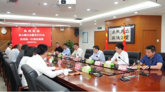 5月18日下午,区委书记、合肥东部新中心党工委书记陆勤山会见光大银行合肥分行行长史付民一行,双方就进一步深化金融合作、助力区域发展进行深入交流。区领导沈校根、黄贺参加。