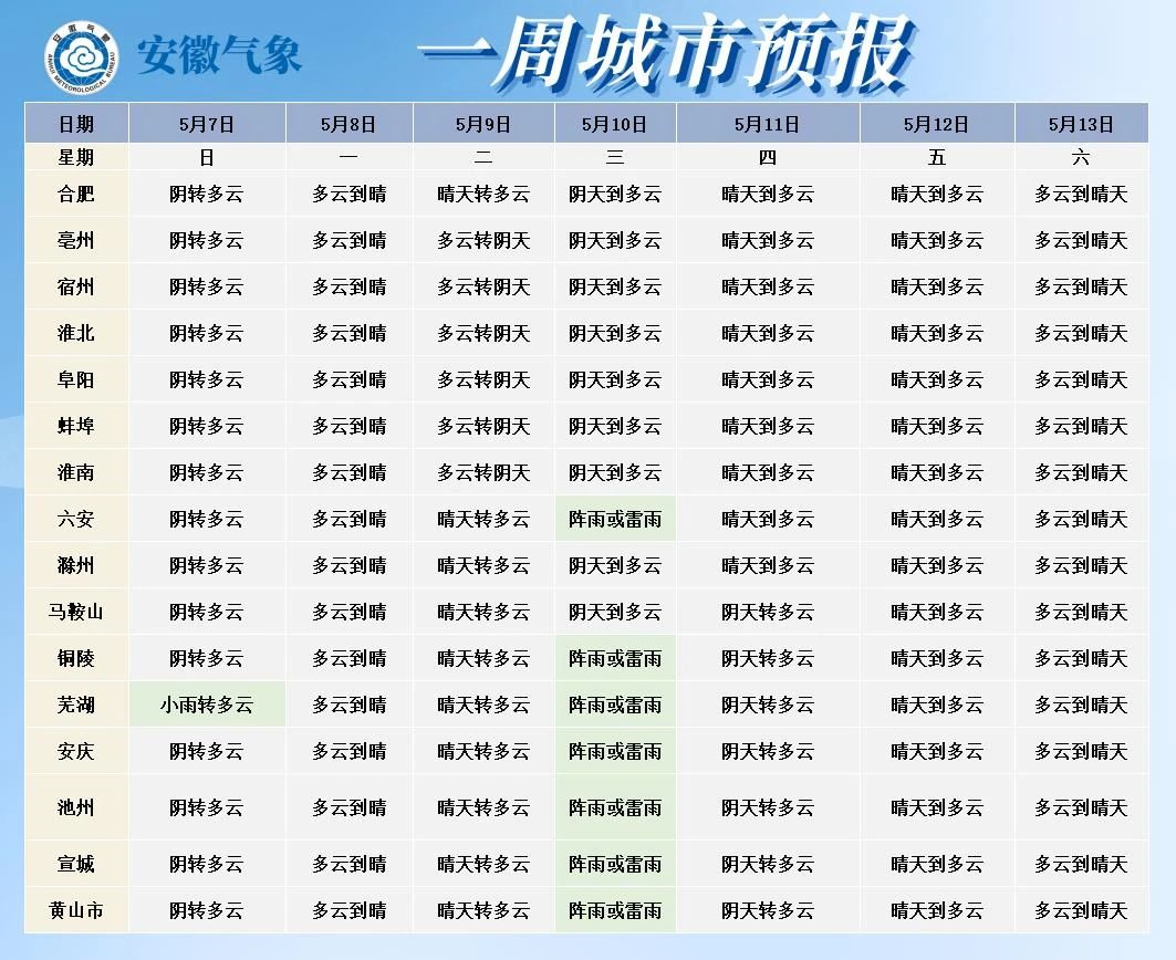 7日(周日):全省阴天转多云,江南部分地区有小雨。9日(周二):淮北地区多云转阴天,淮河以南晴天转多云。10日(周三):大别山区和沿江江南阴天到多云,部分地区有阵雨或雷雨;其他地区多云。