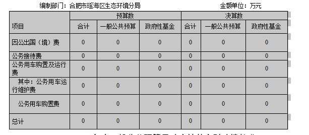 合肥市瑶海区生态环境分局2022年度一般公共预算及政府性基金财政拨款“三公”经费支出决算中,因公出国(境)费支出决算0万元,占0%;公务接待费支出决算0万元,占0%;公务用车购置及运行费支出决算0万元,占100%。具体情况如下: