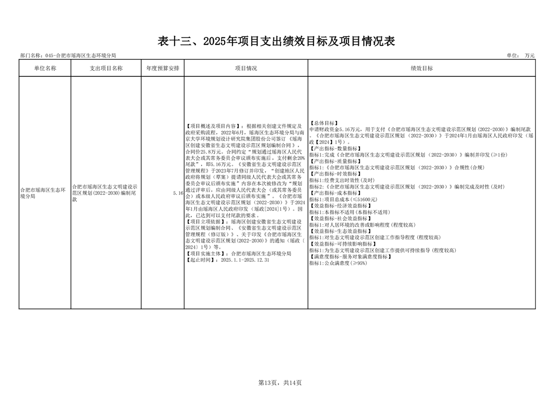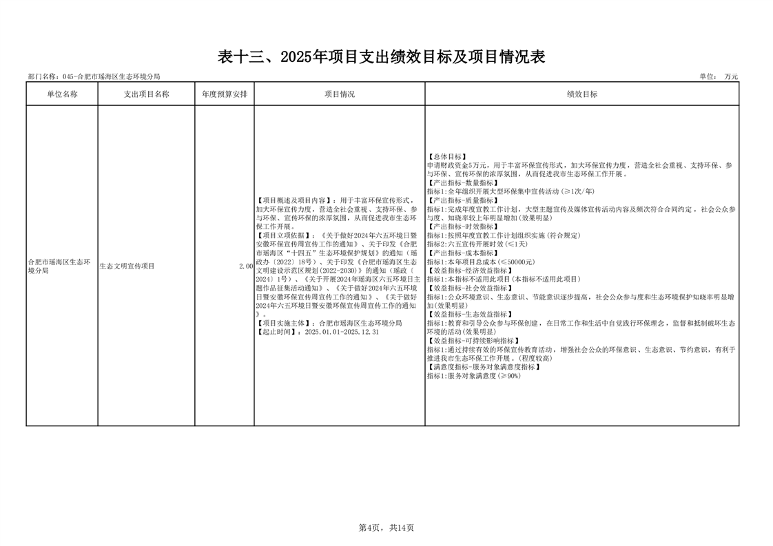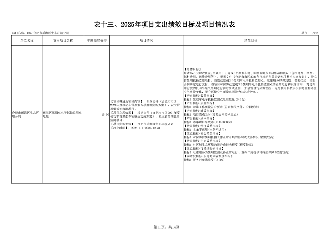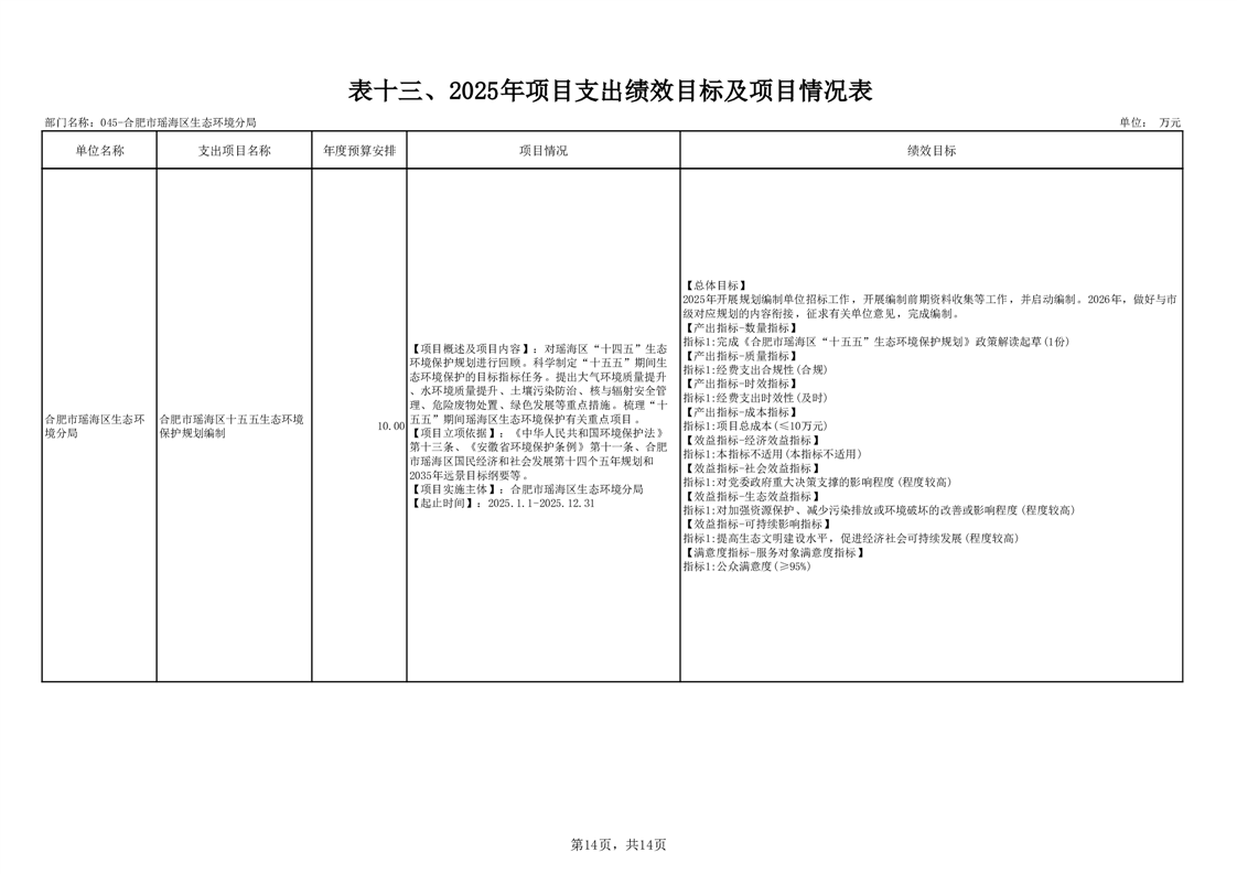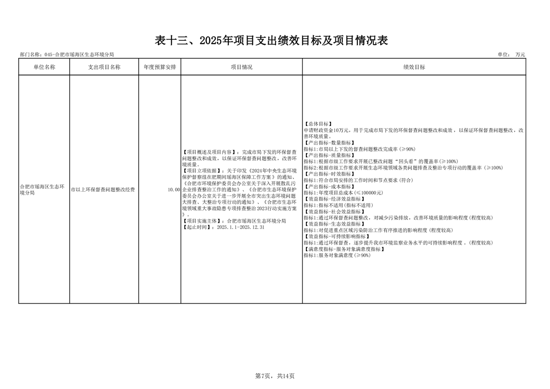瑶海区生态环境分局2025年项目支出绩效目标及项目情况表 |