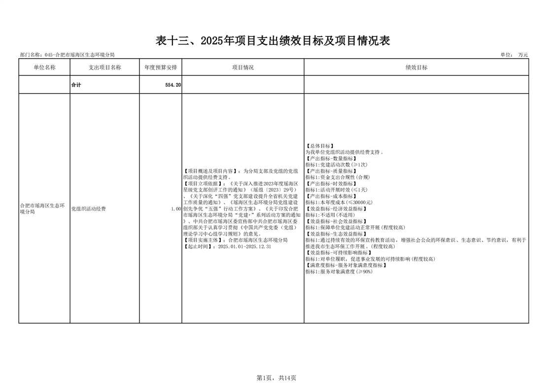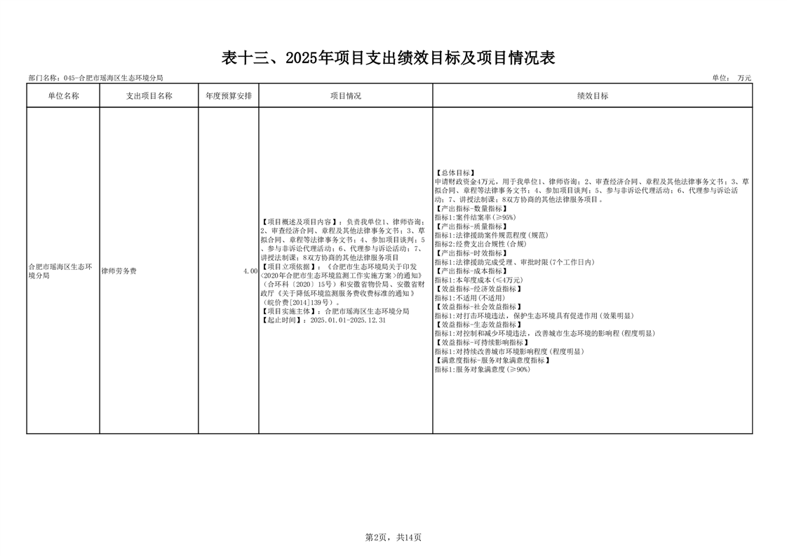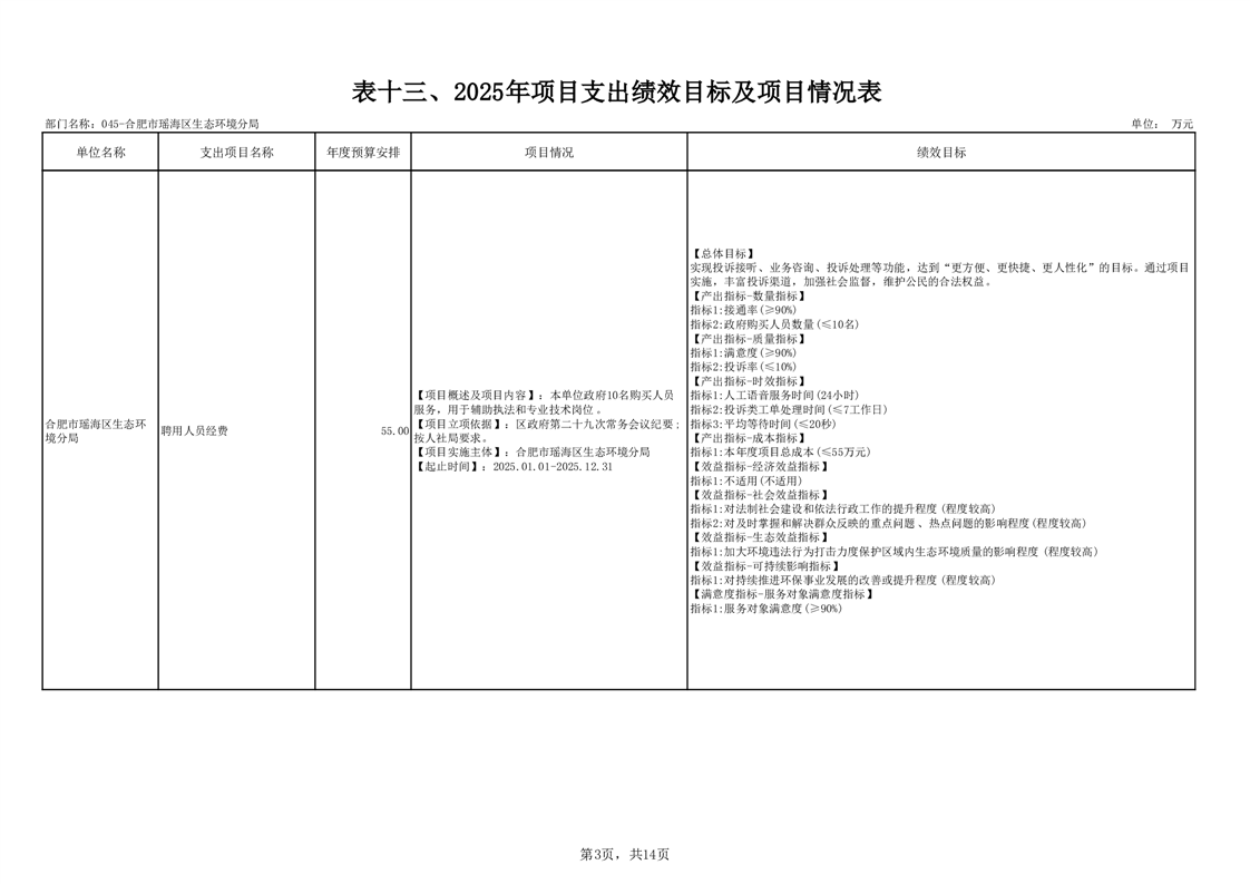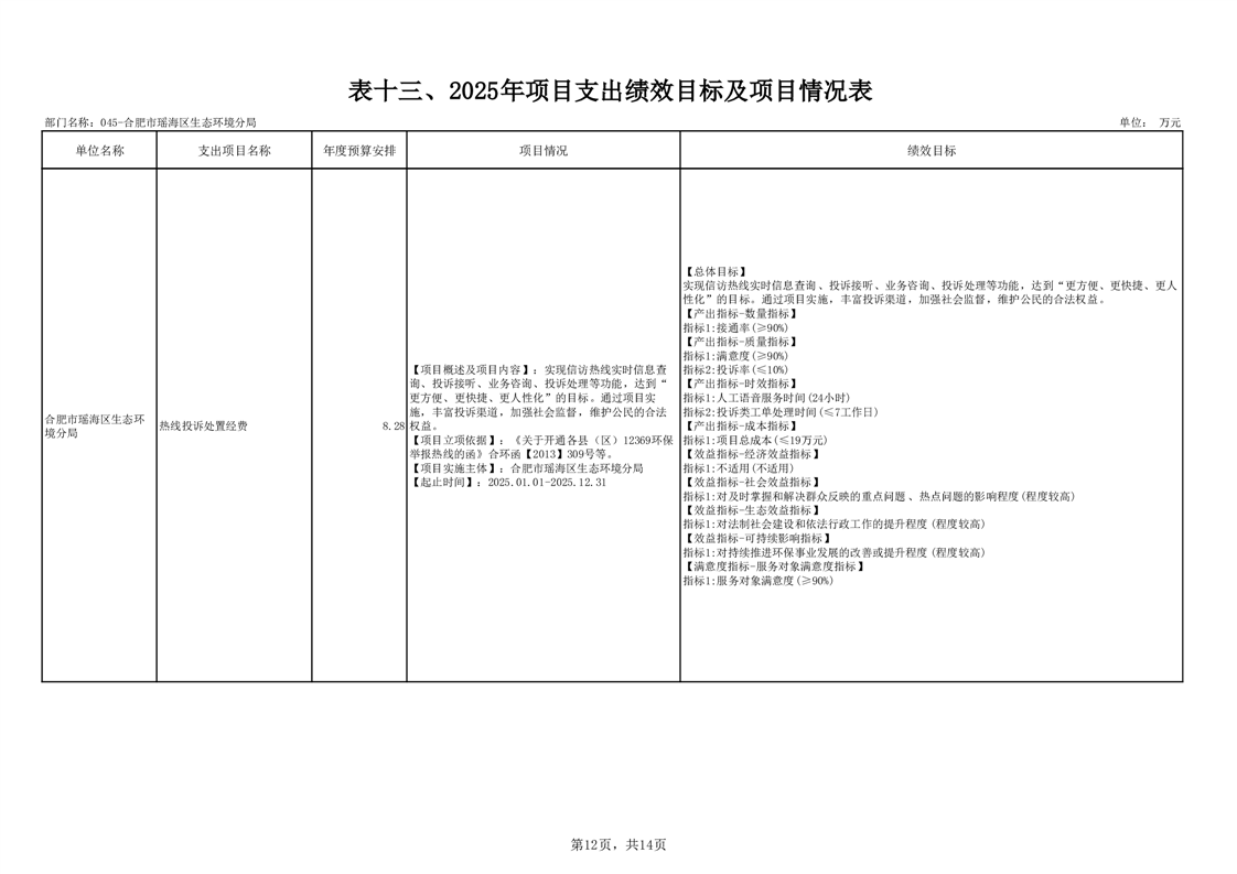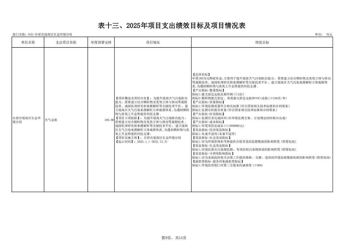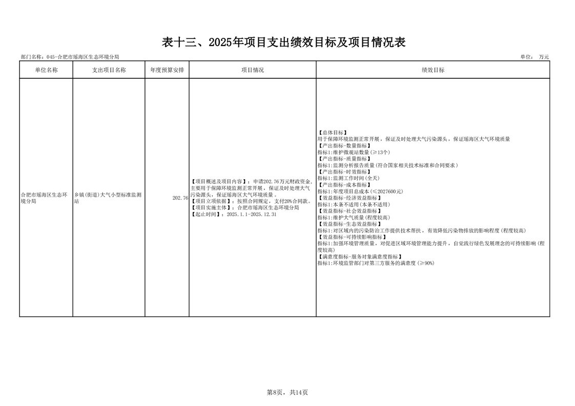瑶海区生态环境分局2025年项目支出绩效目标及项目情况表 |