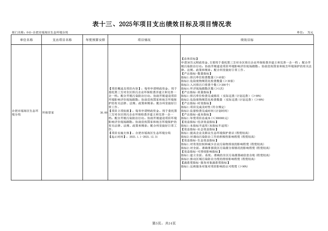 瑶海区生态环境分局2025年项目支出绩效目标及项目情况表