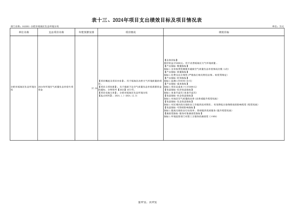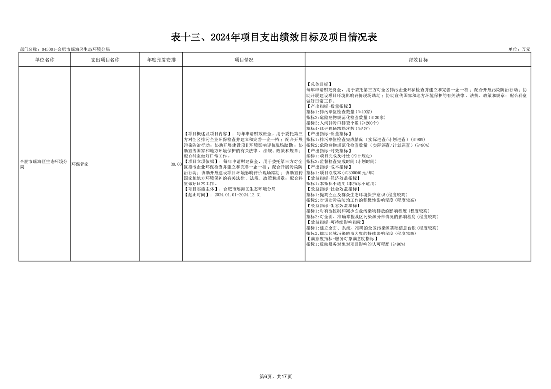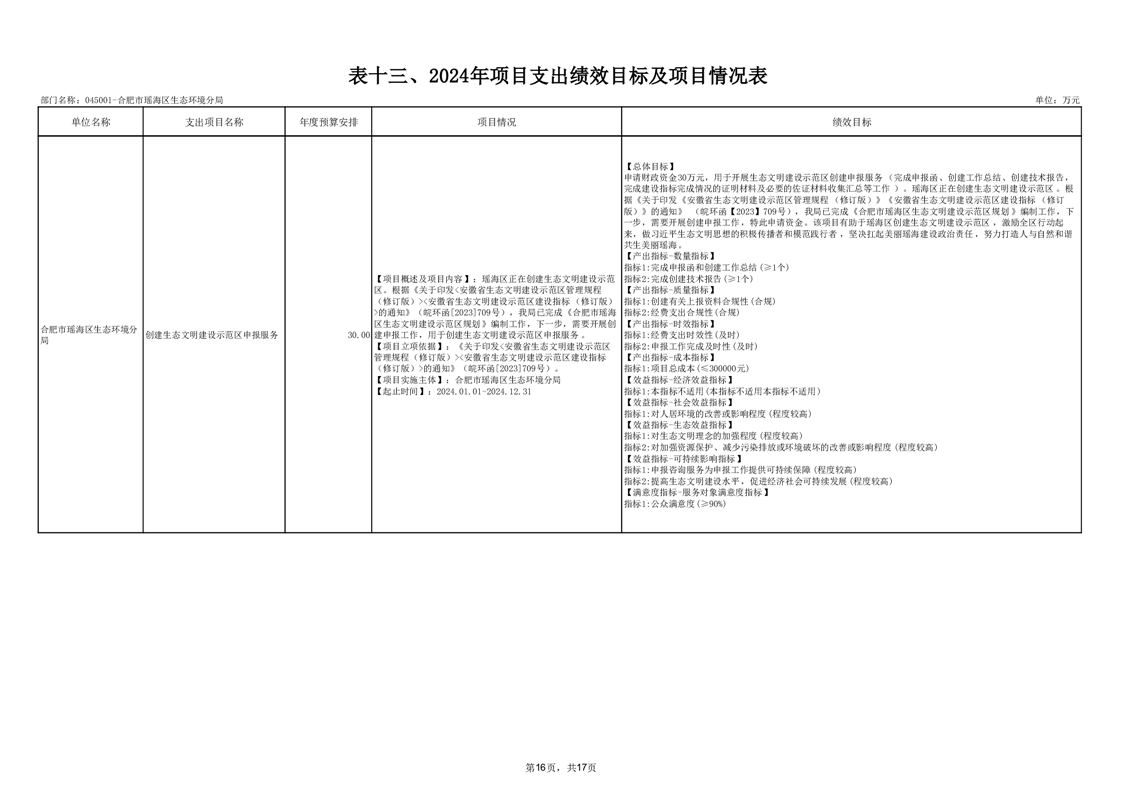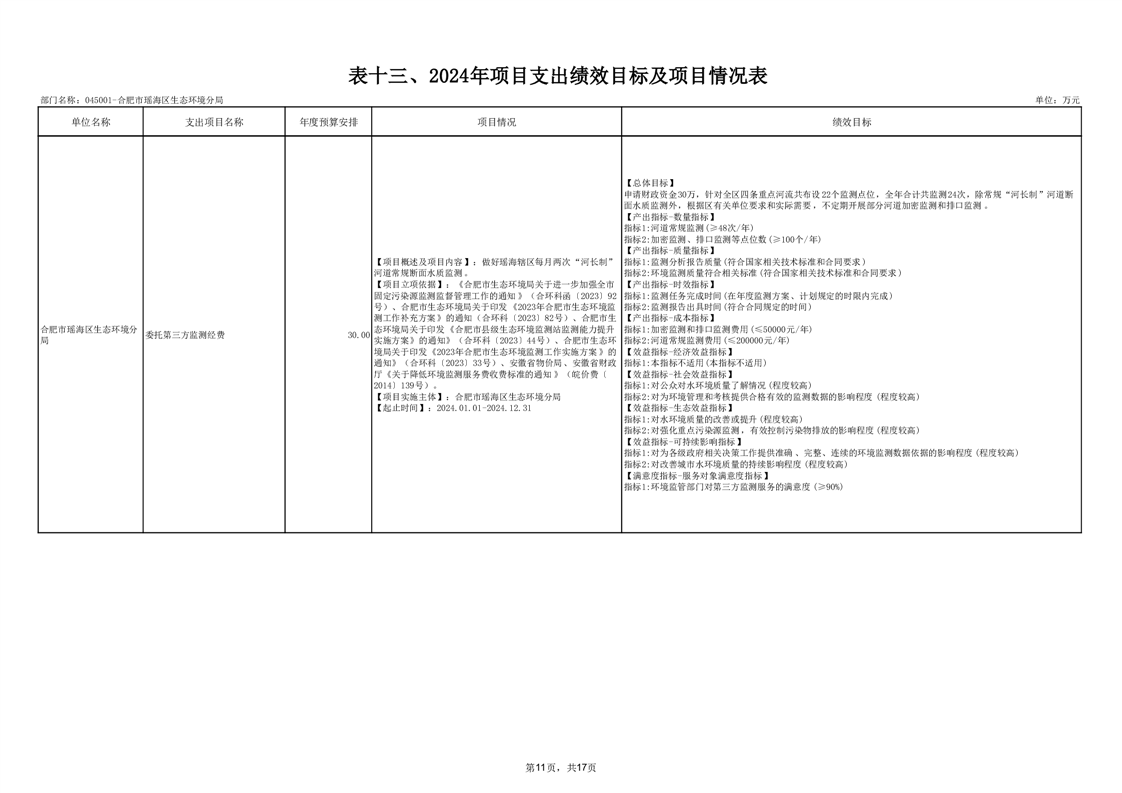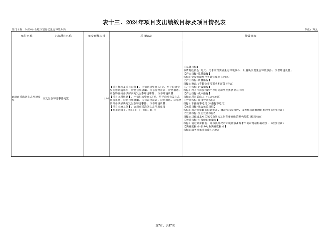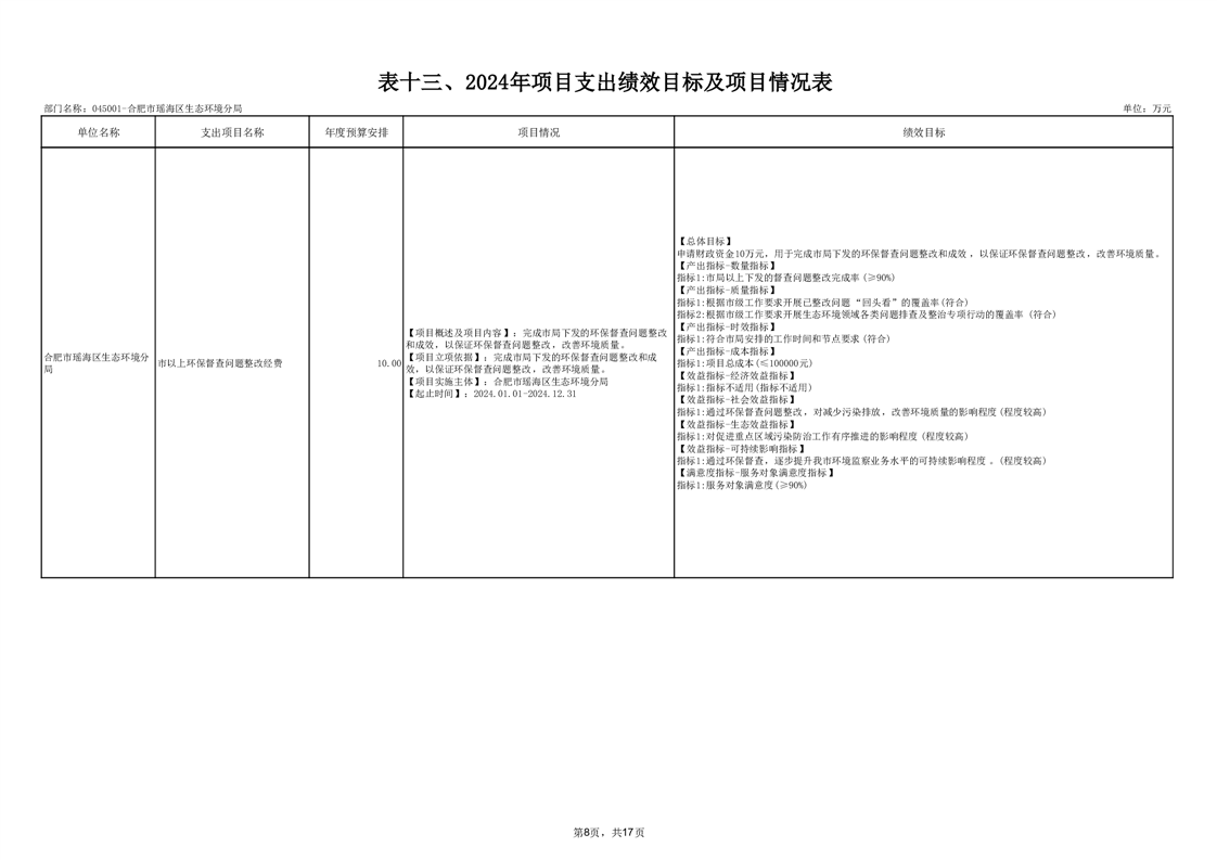 区生态环境分局2024年项目支出绩效目标及项目情况表 |