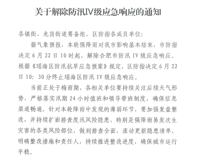 关于解除防汛IV级应急响应的通知 |