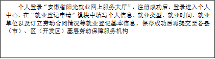 法定劳动年龄内的实现就业的劳动者登录“安徽省阳光就业网上服务大厅”,注册成功后,登录进入个人中心,在“就业登记申请”模块中填写个人信息、就业类型、就业时间、就业单位以及订立劳动合同情况等就业登记基本信息,保存成功后再提交至各县(市)、区(开发区)基层劳动保障服务机构。各县(市)、区(开发区)基层劳动保障服务机构对个人提交的就业登记信息进行受理、审核。