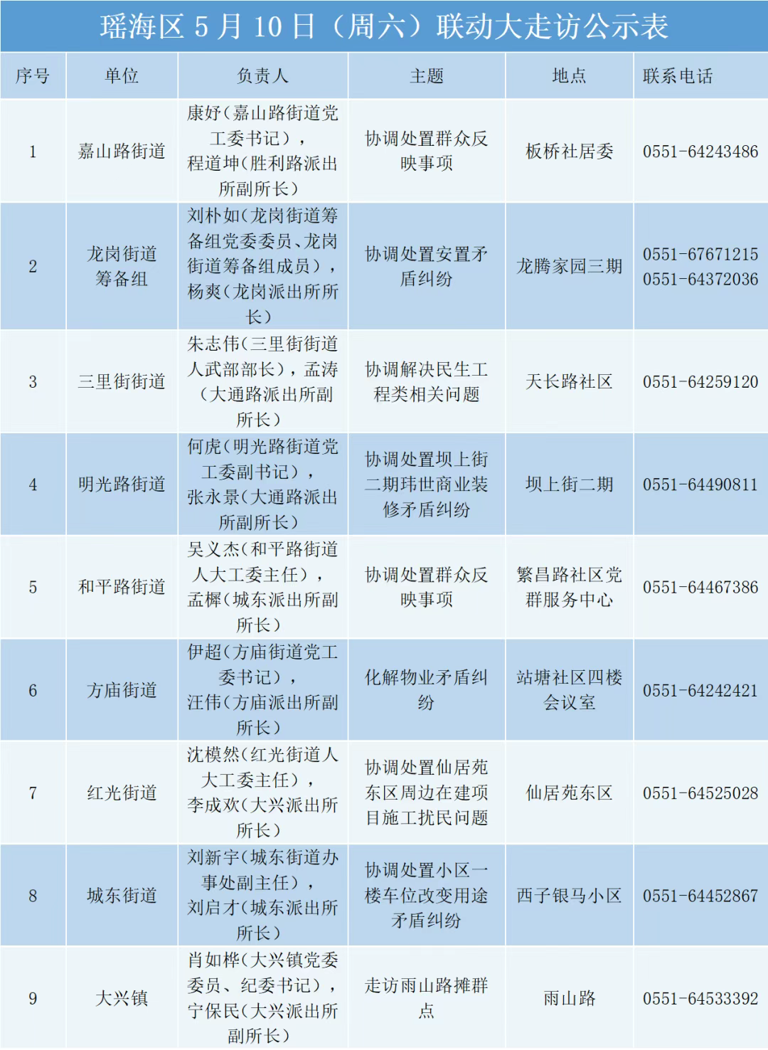 详见《瑶海区5月10日(周六)联动大走访公示表》。