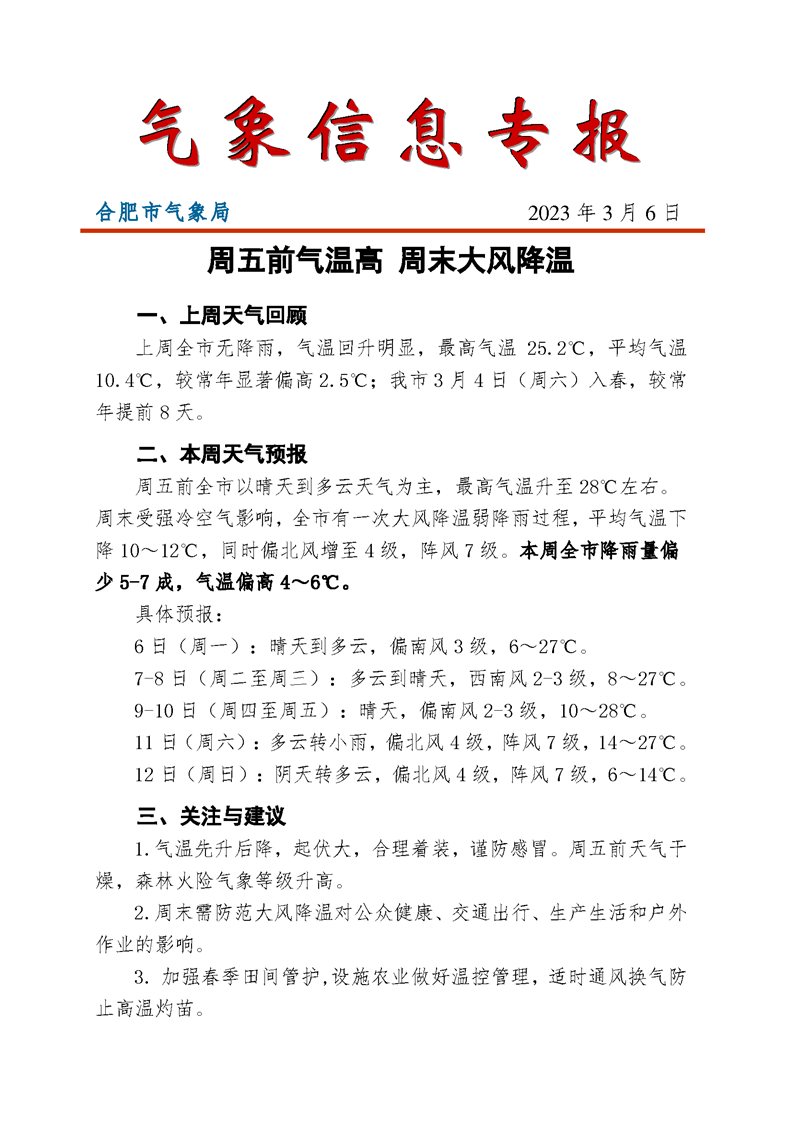 自然灾害类】合肥市气象局3月6日发布气象信息专报