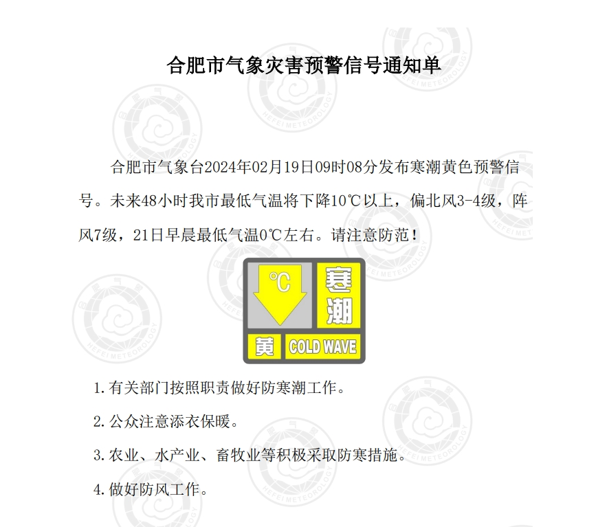 【自然灾害类】合肥市气象台2024年2月19日09时08分发布寒潮黄色预警信号 |