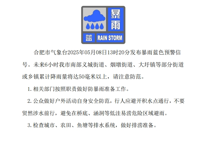 【自然灾害类】合肥市气象台2025年05月08日13时20分发布暴雨蓝色预警信号