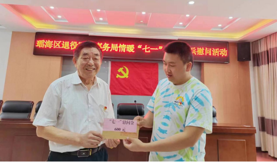 图为瑶海区退役军人事务局为新海家园小区退役老兵老党员送上慰问金。