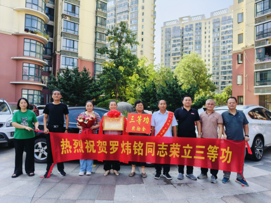 8月30日上午,瑶海区退役军人事务局会同城东街道和隆岗社区,为在部队荣立三等功的隆岗村现役军人罗炜铭家属送上立功喜报和奖励金。感谢他们为部队和家乡培养了一名优秀军人,希望他们继续鼓励罗炜铭同志在部队发扬优良作风,争取再立新功。