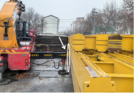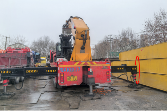 事故发生点位于吊车右后侧向外伸展中的支腿梁端部与堆放的行车横梁之间(见图1、图2、图3)。