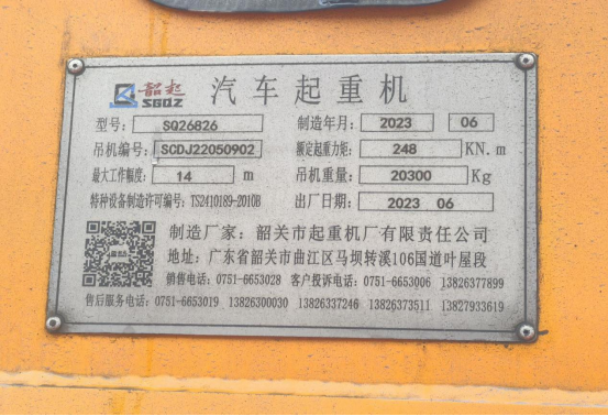 吊车型号SQ26826,吊机编号SCDJ22050902,特种设备制造许可编号TS2410189-2010B,额定起重力矩248KN.m,最大工作幅度14m,制造年月2023年6月,出厂日期2023年6月,制造厂家韶关市起重机厂有限责任公司(见图4)。