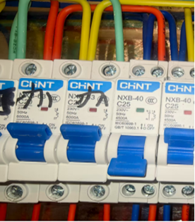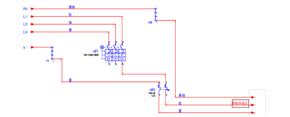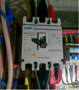 2.电气线路。御包坊餐饮公司店铺,主配电外接一路380V电缆,沿西北侧安装在配电箱中,通过NM1-250S/3300 250A塑壳断路器(见图3-1),采用三相五线制,下端连接断路器,并分路为380V和220V给店内各类用电器进行供电(见图3-2)。