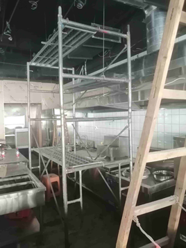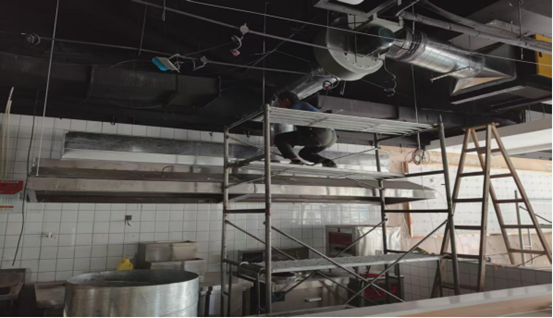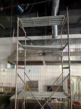 1.事故现场。位于瑶海区方庙街道临泉路与泗州路交口御包坊餐饮公司店铺中部北侧集烟罩区域。自店铺东门进入室内,北侧由柜台围合作为烹饪区,南侧为通道,烹饪区内放置有金属脚手架一具、便携式木梯两具,靠墙上方可见事发油烟净净化设备。
