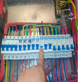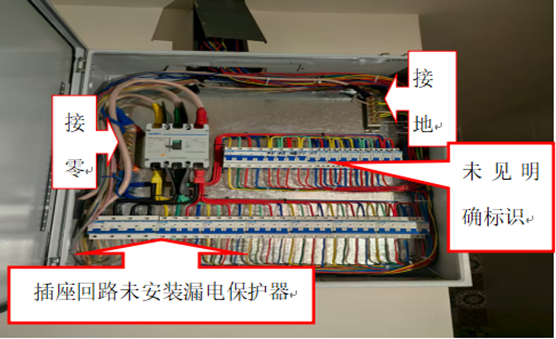配电箱线路走向规范,接地、接零紧固有效,负荷设计满足使用要求。但部分断路器控制对象标识不齐全,插座回路未安装漏电保护器,现场电气开关未见明确的标识。(见图3-3)
