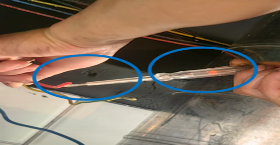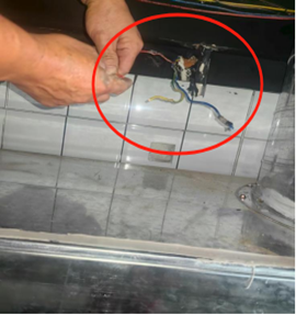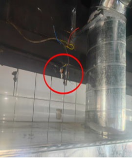 事发现场有一具金属脚手架(图4-4),高约2.7米,无橡胶轮。靠近脚手架北侧安装有集烟罩,在集烟罩上方北侧墙体上安装有两路电源,其中一路采用三芯电缆线,线路裸露(图4-5),经排查线路,该路电缆上端未接电源(图4-6)。另一路电源线采用三根4mm2单股BV线(图4-7),红色为火线,绿色为零线,黄绿线为PE线,电压为220V,该线路上端与主配电箱右侧第七组断路器相连(图4-8、图4-10)。经检查测试,距火线端头约30mm处绝缘层有破损,带电体外露(图4-9)。
