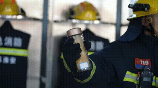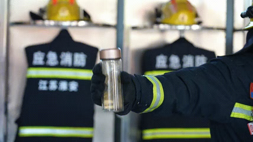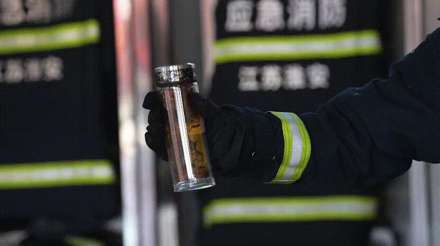 消防员在保温杯内倒入热水,加入红枣、枸杞。摇晃一段时间后,保温杯内有大量小气泡产生