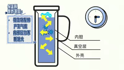 保温杯的内胆、瓶盖缝隙等处可能藏匿细菌,而红枣、枸杞等食材营养较为丰富,经水浸泡后,微生物发酵产生大量气体,密闭的保温杯内部气压不断增大,一旦杯盖被突然拧开,就可能导致液体喷涌而出,发生爆炸伤人事件。2.化学反应除垢剂与保温杯内胆的水垢接触后会发生化学反应,产生大量气体。若此时保温杯处于密闭状态,气体无法及时排出,杯内气压会迅速升高,当压力超过杯体承受极限时,就可能引发爆炸。保温杯内加热水和泡腾片后爆炸,主要是因为在杯内密封环境下会产生大量气体,而摇晃后杯内的压力会明显增加,从而让杯子爆炸。