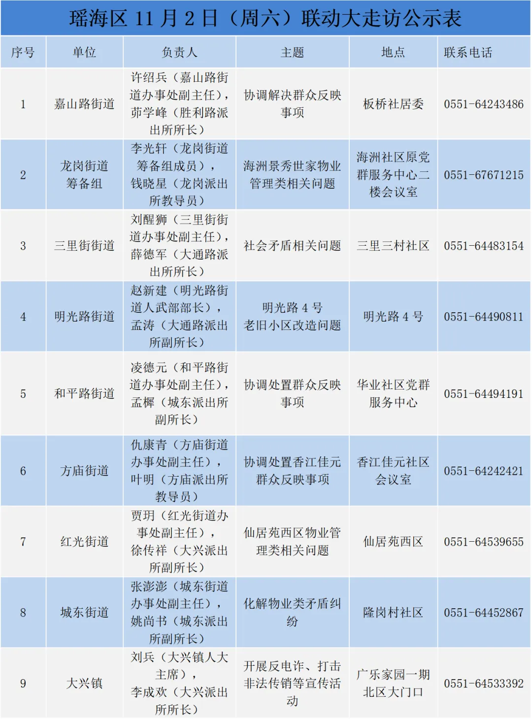 详见《瑶海区11月2日(周六)联动大走访公示表》。
