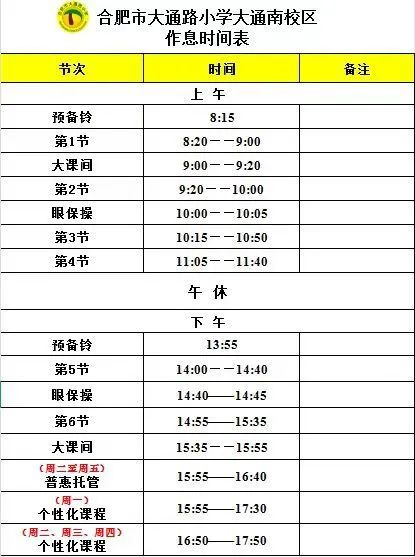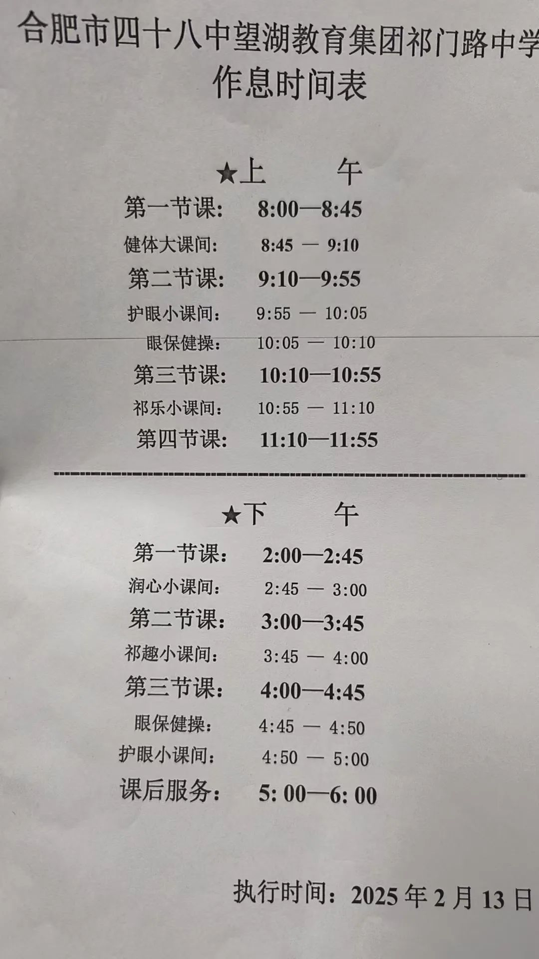 依据新的作息时间表,该校上午第一节课开始时间为8点20分,放学时间为11点40分;下午第一节课时间为2点,个性化课程最晚结束时间为5点50分,与以往并无变化。细看每节课起止时间不难发现,上下午2次大课间的时间由原来的30分钟缩短至各20分钟,这也是小课间所增时长的由来。合肥市第四十八中学望湖教育集团祁门路中学教务处主任马俊介绍,小课间时间增加后,上学时间没变,仅上午的放学时间延迟5分钟,下午放学时间依旧不变。