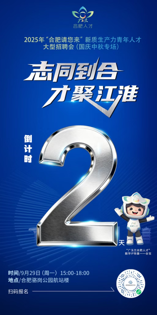 9月29日下午3点,“志同到合 才聚江淮”2025年“合肥请您来”新质生产力青年人才大型招聘会(国庆中秋专场)将于骆岗公园航站楼正式启幕!200家用人单位,1万+优质岗位重磅来袭!