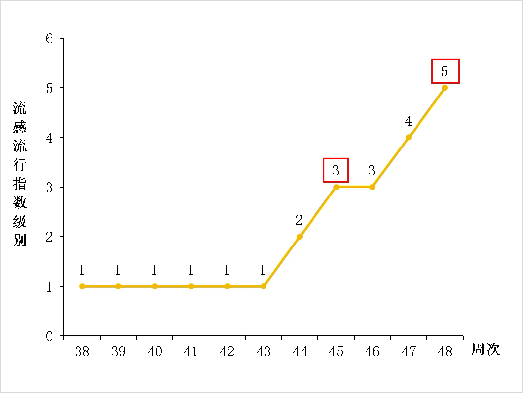 安徽省流感流行等级已于2025年第45周由第2级提升至第3级,标志着进入流感活跃期。2025年第48周(11月24日—11月30日),流感活动将达到高水平,公众感染风险增高。