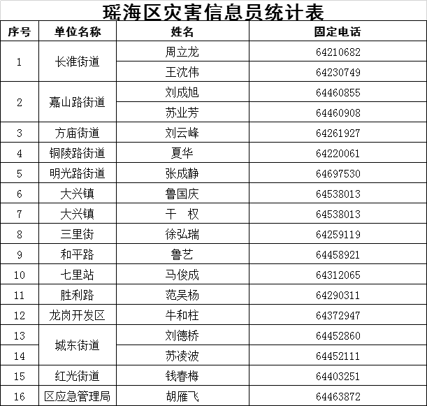 | 名 称: | 瑶海区2020年灾害信息员统计表(区、街两级) | ||