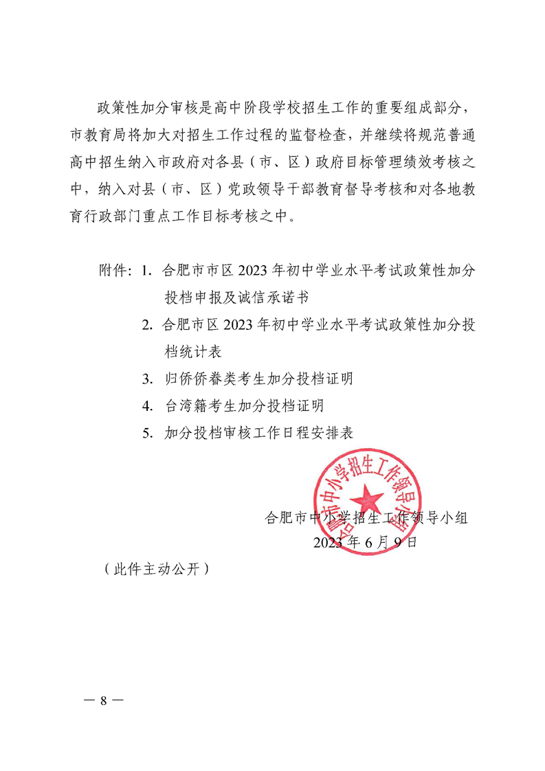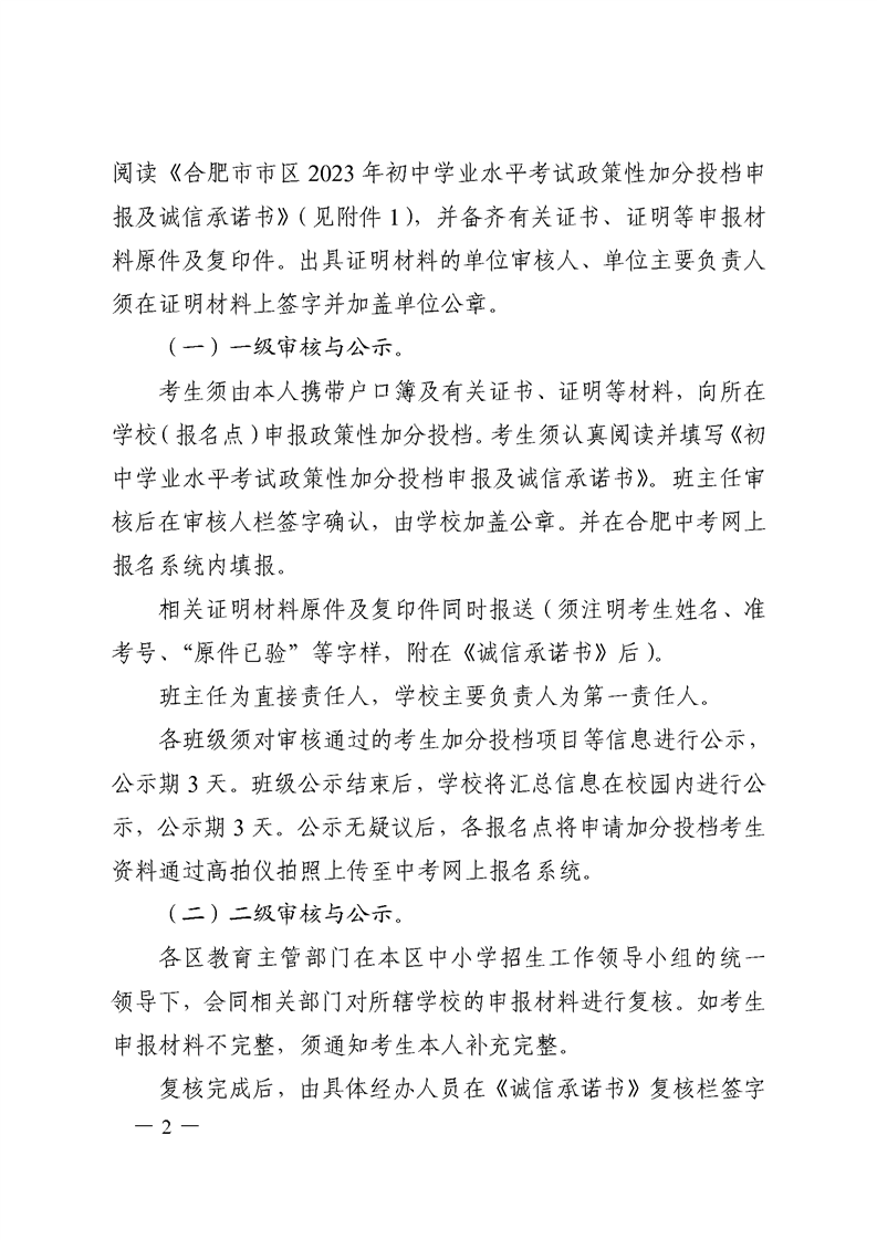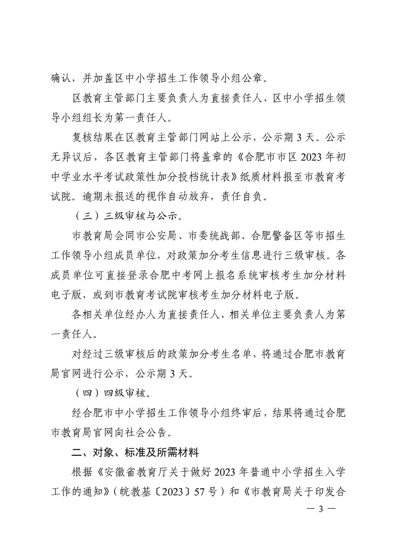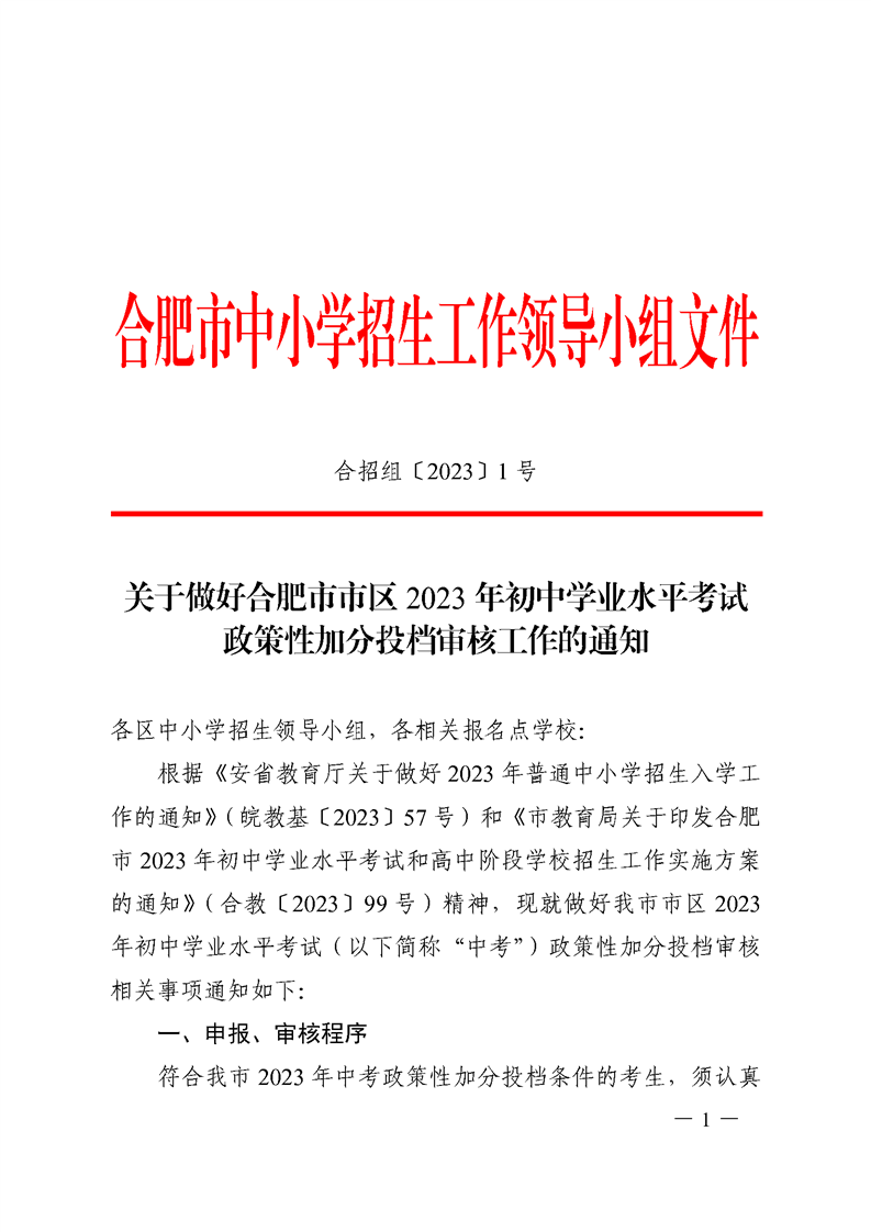 【政策文件】合招组〔2023〕1号关于做好合肥市市区2023年初中学业水平考试政策性加分投档审核工作的通知