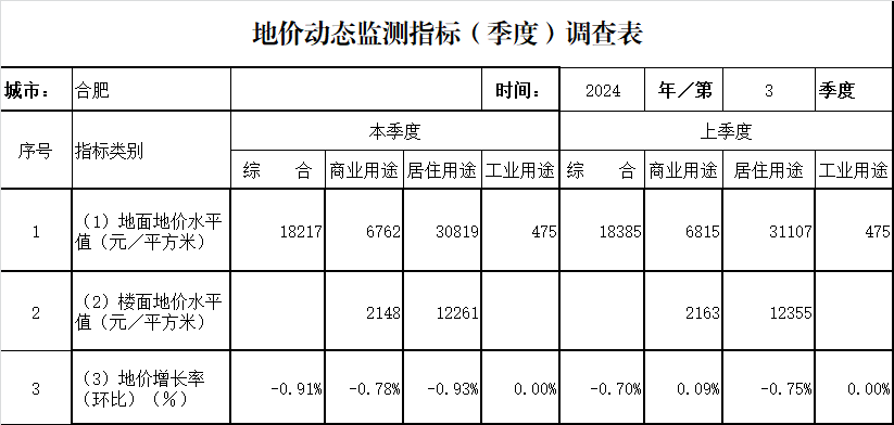 | 名 称: | 合肥市2024年第三季度地价动态监测表 | ||