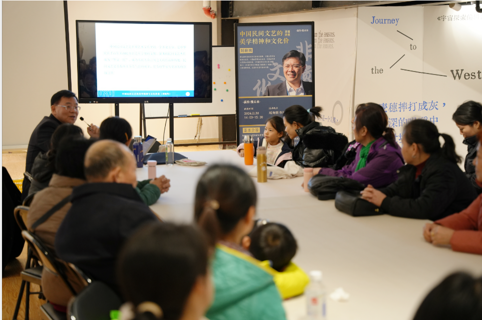 活动现场,第九届中国民间文艺家协会理事、中国文艺评论家协会会员刘晓明老师走进瑶海图书城开展《中国民间文艺的美学精神和文化价值》主题讲座。刘老师结合自身经历,以非物质文化遗产蕴含的民俗美学为切入点,深入浅出地讲解了非物质文化遗产概念内涵、界定与外延。非遗是优秀传统文化在今天生活的现实体现,非遗保护的过程,是了解传统、尊重传统、发展传统,使传统不断融入当代生活的过程,刘老师用生动的事例和精辟的论述,让读者们知晓非物质文化遗产是一个丰富而多元的概念体系。