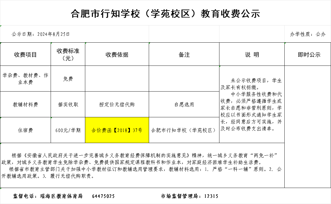 合肥市行知学校(学苑校区)教育收费公示