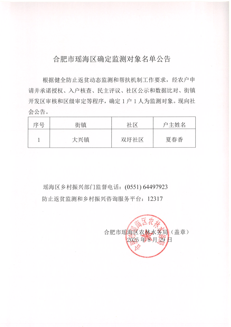 | 名 称: | 确定监测对象名单公告(大兴新增夏春香) | ||