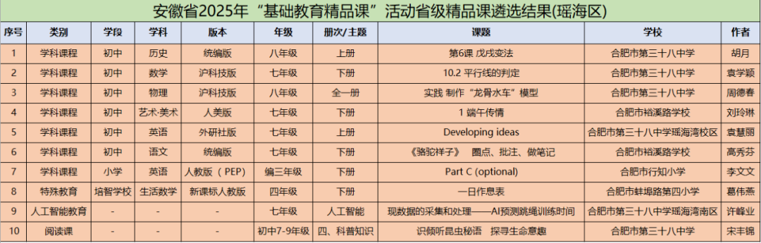 近日,安徽省2025年“基础教育精品课”遴选结果正式发布,瑶海区共有10项作品荣获省级精品课称号,其中初中阶段8项、小学阶段2项,用优异成绩交出了区域教育高质量发展的精彩答卷。