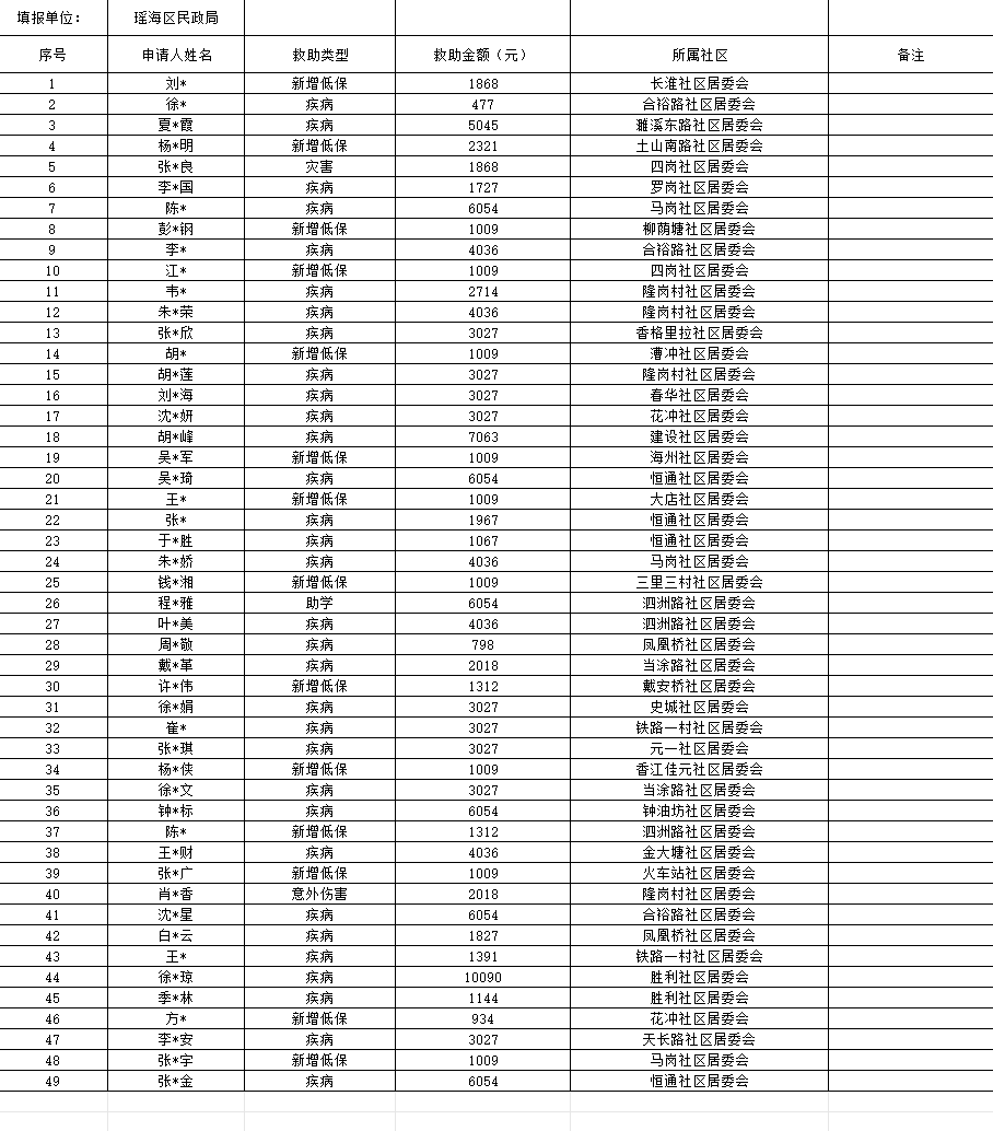 | 名 称: | 2025年8月瑶海区困难群众临时救助花名册 | ||