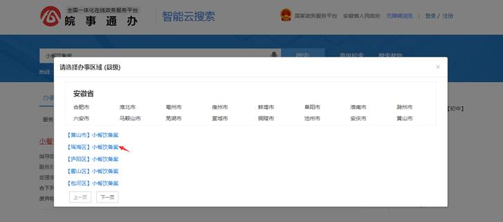 选择所办事项(如小餐饮备案)选择对应的行政区域,如下图所示: