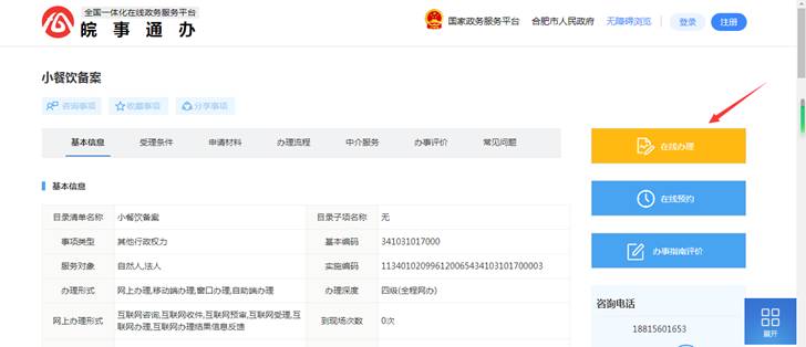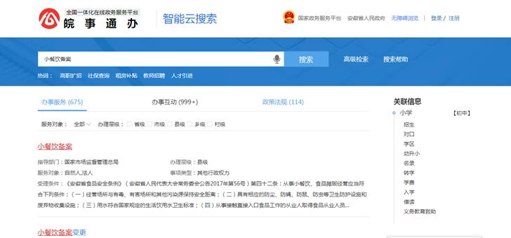 输入事项名称(小餐饮备案)进行查找。显示界面如下图所示:
