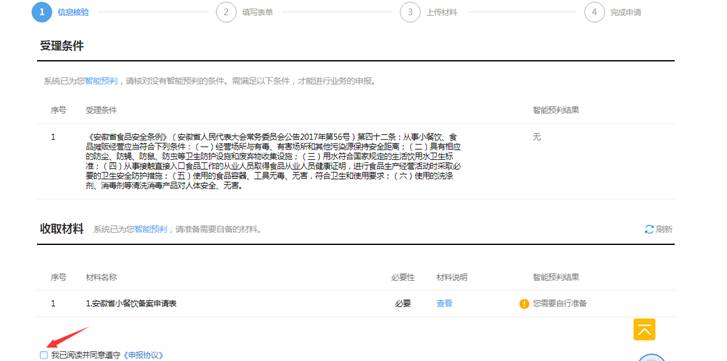 仔细阅读页面所列材料内容,下载安徽省小餐饮备案申请表,选择我已阅读并同意遵守《申报协议》。