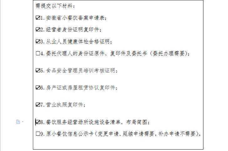 按照安徽省小餐饮备案申请表填写好,并附上第三页上需要提交的材料。如下图所示打钩的部分(如果是委托他人办理第4项也是需要提供的)
