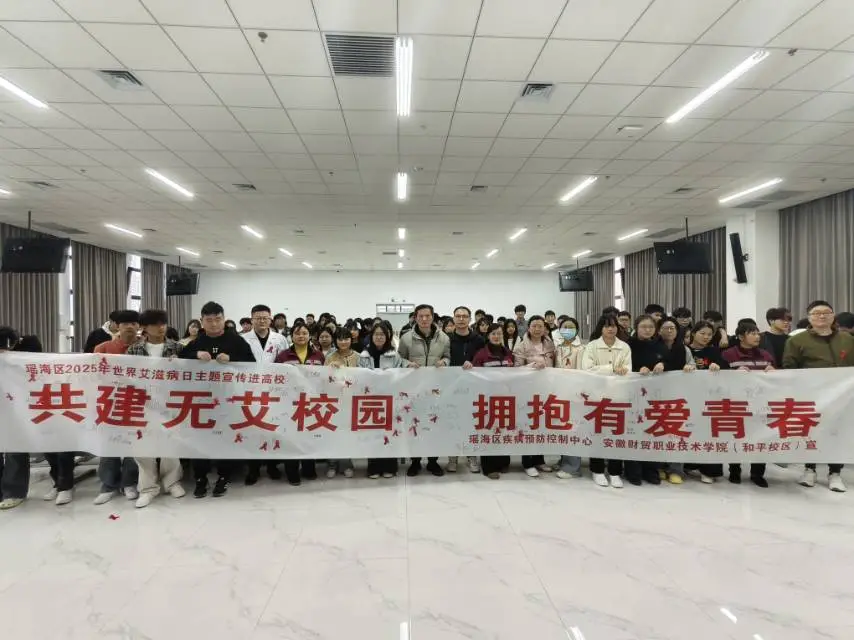 在2025年12月1日第38个“世界艾滋病日”来临之际,为深入宣传普及艾滋病防治知识,提高青年学生的健康安全意识与自我保护能力,11月26日下午,瑶海区疾控中心、合肥市疾控中心、合肥青卫中心、瑶海区妇女儿童保健中心及大兴社区卫生中心,共同走进安徽财贸职业学院(和平校区),成功举办了以“共建无艾校园,拥抱有爱青春”为主题的世界艾滋病日进高校宣传活动。