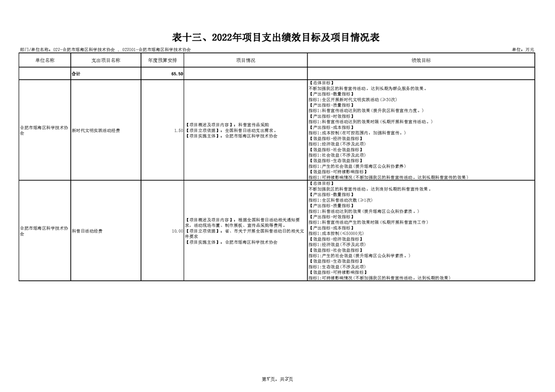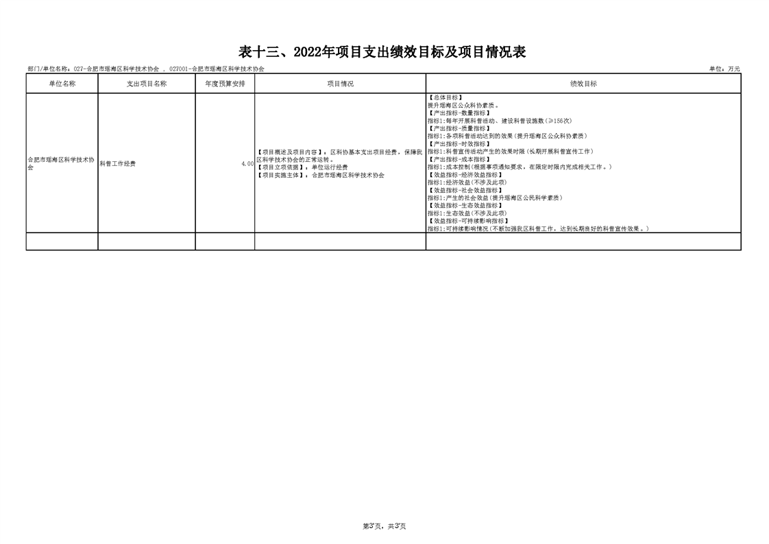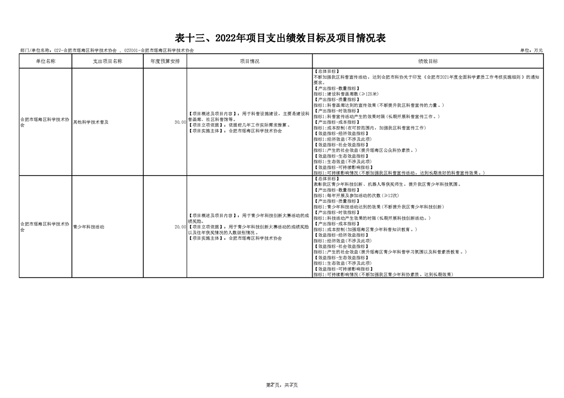 区科协2022年项目支出绩效目标及项目情况表 |