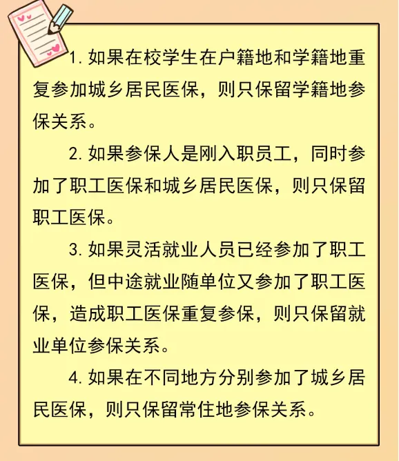 重复参加城乡居民医保的常见情形:参保人在户籍地和常住地两个统筹区分别参加城乡居民医保,或者学生在户籍地和学籍地两个统筹区分别参加城乡居民医保。