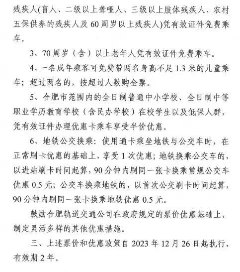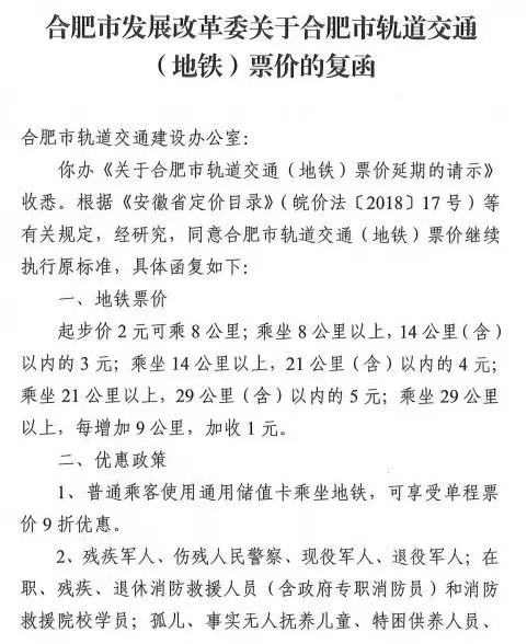 10月13日,合肥市发改委网站发布《2023合肥市发展改革委关于合肥市轨道交通(地铁)票价的复函》,同意合肥市轨道交通(地铁)票价继续执行原标准。记者从合肥市轨道集团等部门获悉,合肥市轨道交通票价未来两年将不涨价,继续执行原标准。