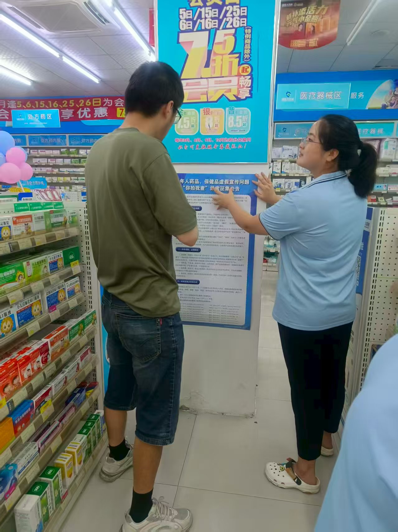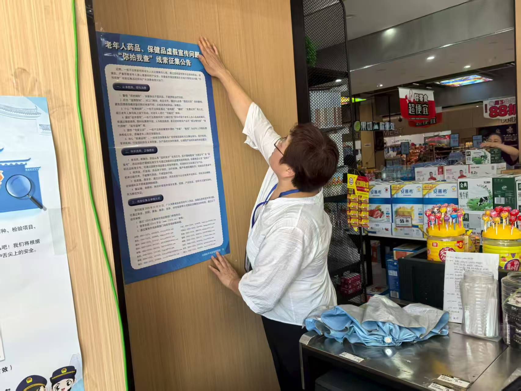 2025年8月,瑶海区市场监管局组织执法人员在药房、养生馆、农贸市场等老年人聚集场所张贴老年人药品保健品虚假宣传等问题“你拍我查”活动公告,加大宣传,向群众广泛征集问题线索。
